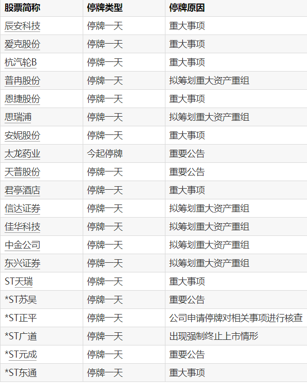 【A股停牌提示:20股今日停牌】Wind数据显示,12月2日,辰安科技、爱克股份、杭汽轮B等20只个股停牌。