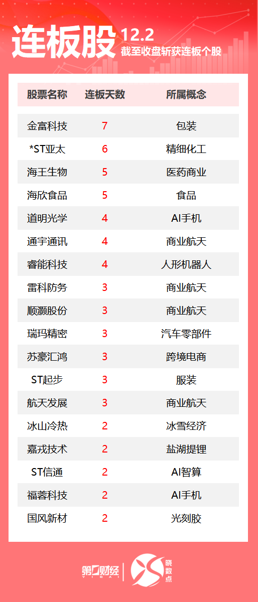 16:08【连板股追踪丨A股今日共55只个股涨停 这只医药商业股5连板】12月2日,Wind数据显示,A股市场共计55只个股涨停。其中医药商业板块海王生物收获5连板;商业航天概念多股连板,通宇通讯4连板,雷科防务、顺灏股份、航天发展均3连板。一图速览今日连板股>>