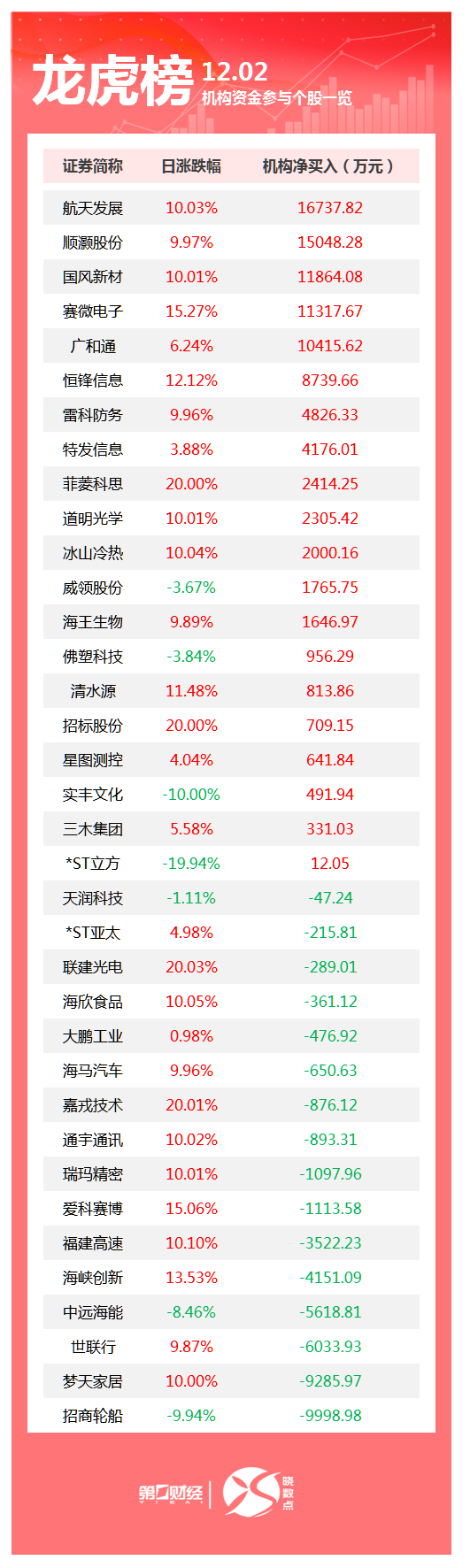 当天机构净买入前三的股票分别是航天发展、顺灏股份、国风新材,净买入金额分别是1.67亿元、1.5亿元、1.19亿元。