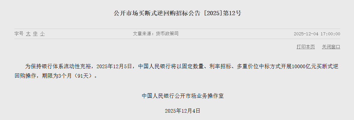 17:03【央行:明日开展10000亿元买断式逆回购操作,期限为3个月】央行公告,为保持银行体系流动性充裕,2025年12月5日,中国人民银行将以固定数量、利率招标、多重价位中标方式开展10000亿元买断式逆回购操作,期限为3个月(91天)。