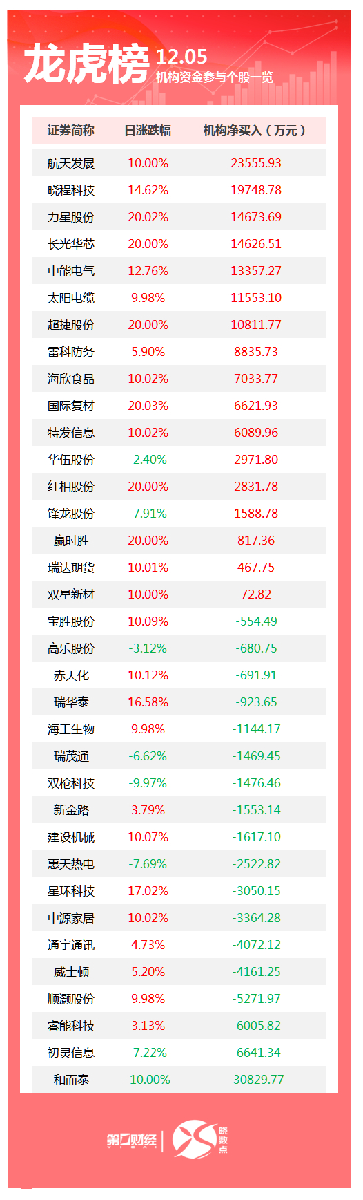 当天机构净买入前三的股票分别是航天发展、晓程科技、力星股份,净买入金额分别是2.36亿元、1.97亿元、1.47亿元。