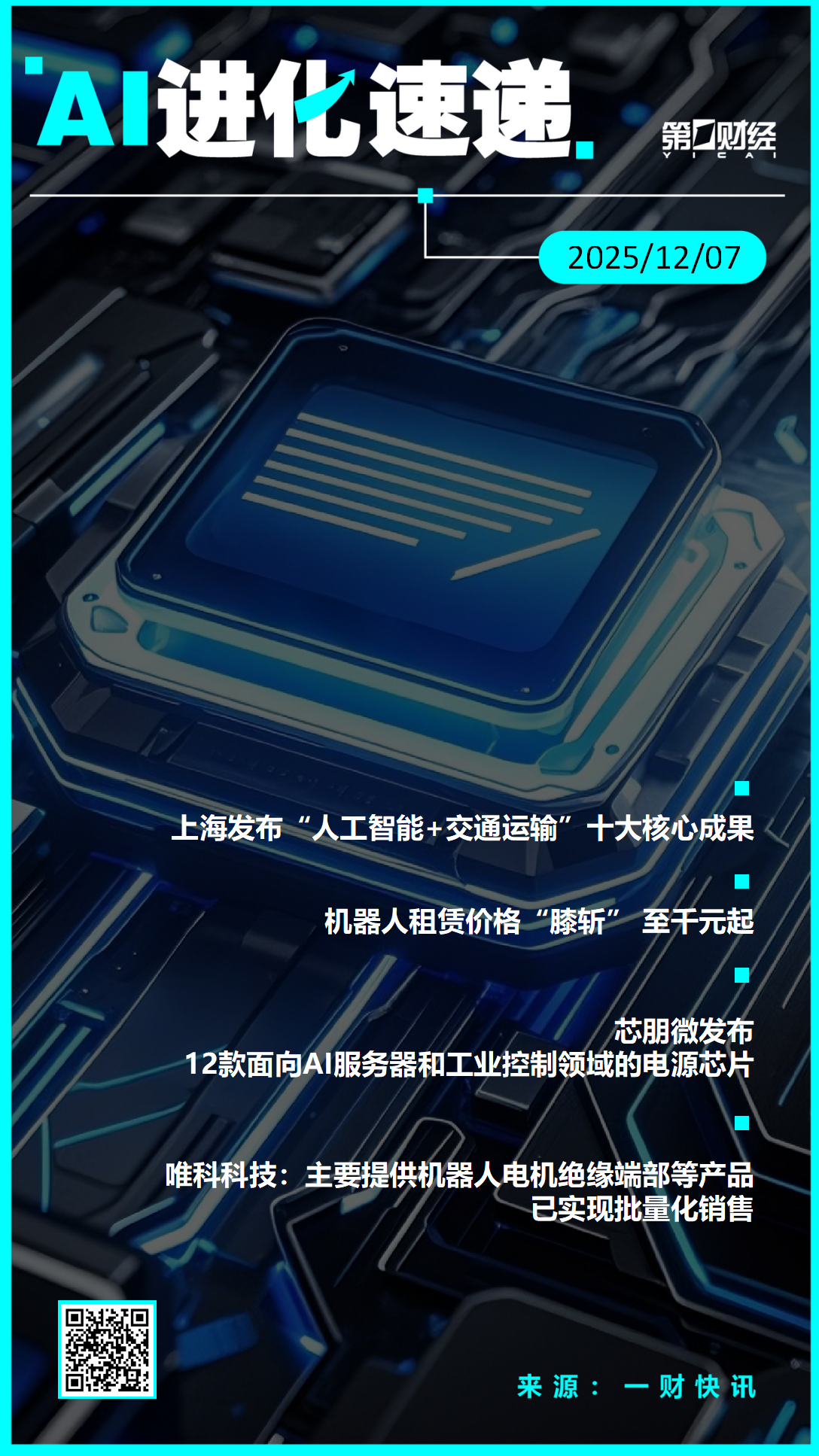 20:20【AI进化速递丨上海发布“人工智能+交通运输”十大核心成果】①上海发布“人工智能+交通运输”十大核心成果;②机器人租赁价格“膝斩” 至千元起;③芯朋微发布12款面向AI服务器和工业控制领域的电源芯片;④唯科科技:主要提供机器人电机绝缘端部、齿轮马达和外壳等产品,已实现批量化销售。