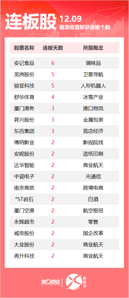 16:21【连板股追踪丨A股今日共54只个股涨停 商业航天板块多股连板】12月9日,Wind数据显示,A股市场共计54只个股涨停。其中商业航天板块多股连板,达华智能、大业股份2连板。一图速览今日连板股>>