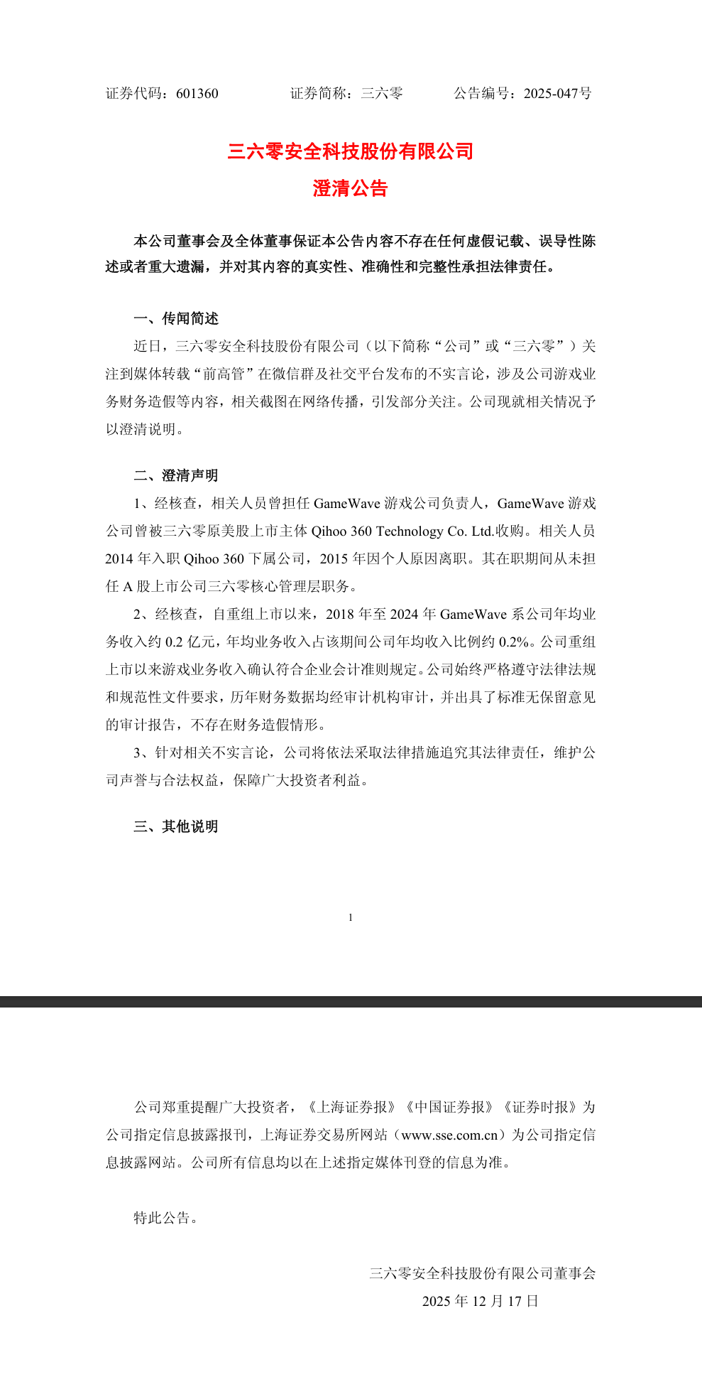 21:46【三六零:相关人员在职期间从未担任核心管理层职务 不存在财务造假情形】三六零公告,近日,三六零安全科技股份有限公司关注到媒体转载“前高管”在微信群及社交平台发布的不实言论,涉及公司游戏业务财务造假等内容,相关截图在网络传播,引发部分关注。公司现就相关情况予以澄清说明。