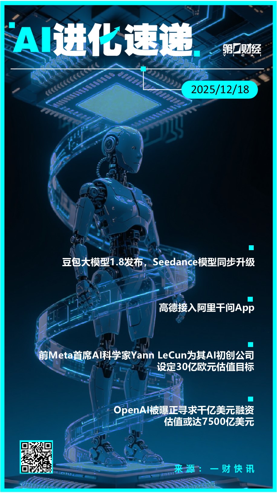 20:48【AI进化速递 | 豆包大模型1.8发布】①豆包大模型1.8发布,Seedance模型同步升级;②高德接入阿里千问App;③前Meta首席AI科学家Yann LeCun为其AI初创公司设定30亿欧元估值目标;④OpenAI被曝正寻求千亿美元融资,估值或达7500亿美元。