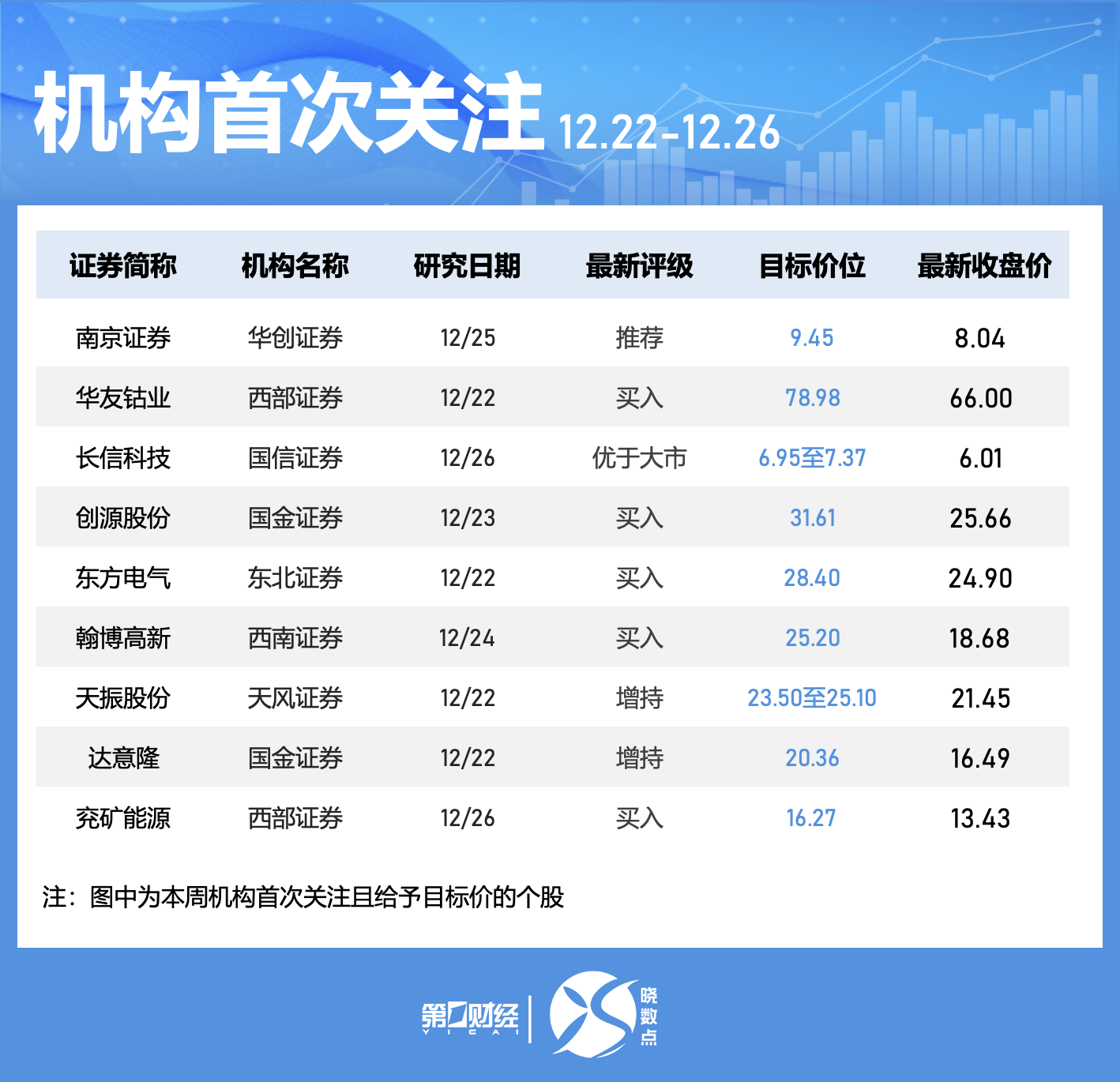 16:03【机构本周首次青睐75只个股】Wind数据显示,机构本周首次关注75只个股,9股被给予目标价。-华友钴业获西部证券给予“买入”评级,目标价78.98元,该股最新收盘价为66元;-创源股份获国金证券给予“买入”评级,被给予目标价31.61元;-东鹏饮料、欧陆通、海光信息、大族数控等个股在列。