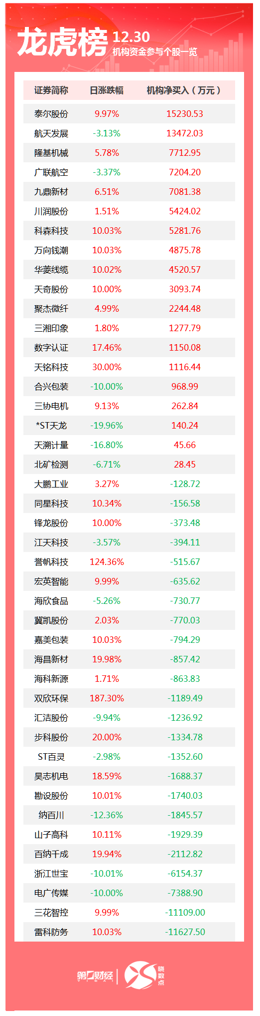 当天机构净买入前三的股票分别是泰尔股份、航天发展、隆基机械,净买入金额分别是1.52亿元、1.35亿元、7713万元。