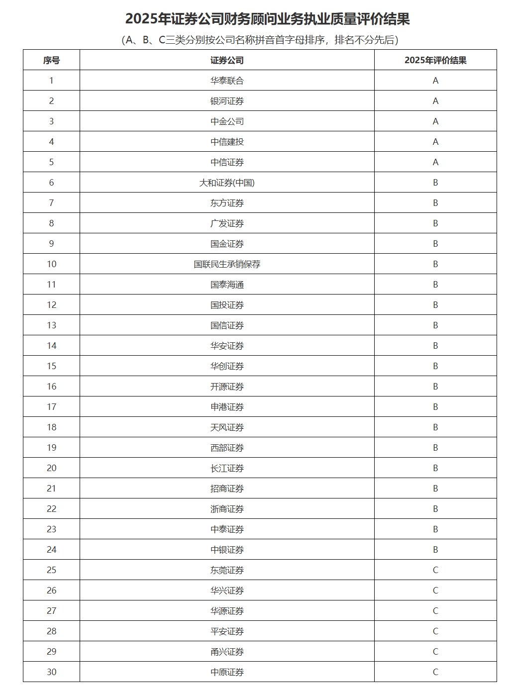 19:02【2025年证券公司财务顾问业务执业质量评价结果公布:A类5家、B类19家、C类6家】中国证券业协会公布2025年证券公司财务顾问业务执业质量评价结果。本次执业质量评价是对各参评证券公司2024年度重大资产重组财务顾问业务情况开展的单项评价,评价期内共30家证券公司从事沪深上市公司重大资产重组财务顾问业务并出具独立财务顾问报告。根据《证券公司重大资产重组财务顾问业务执业质量评价办法(2024年修订)》,评价结果分为A、B、C三类,本次评价结果A类5家、B类19家、C类6家。