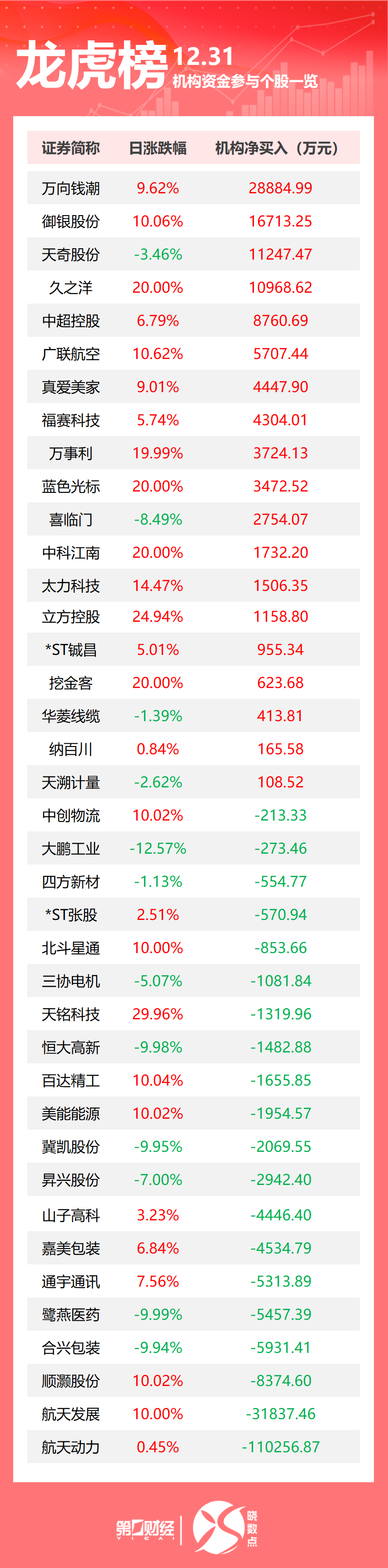 18:33【龙虎榜丨机构今日抛售这20股,买入万向钱潮2.89亿元】盘后数据显示,12月31日龙虎榜中,共39只个股出现了机构的身影,19只股票呈现机构净买入,20只股票呈现机构净卖出。