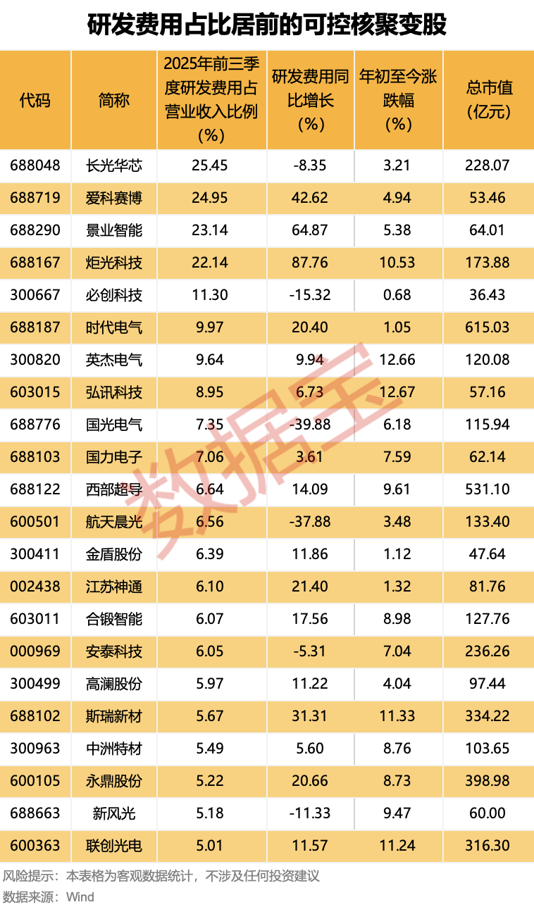 据统计,A股中布局可控核聚变的个股有59只。数据显示,22股2025年前三季度研发费用占营业收入比例在5%以上,长光华芯、爱科赛博、景业智能、炬光科技居前,均超过20%。按研发费用同比增幅来看,上述22股中,16股研发费用同比增长,炬光科技、景业智能和爱科赛博同比增幅居前,分别为87.76%、64.87%、42.62%。