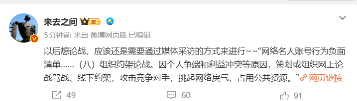 22:31【微博CEO王高飞回应贾国龙罗永浩论战】据北京日报,微博CEO王高飞“来去之间”发布微博:以后想论战,应该还是需要通过媒体采访的方式来进行~~“网络名人账号行为负面清单……(八)组织约架论战。因个人争端和利益冲突等原因,策划或组织网上论战骂战、线下约架,攻击竞争对手,挑起网络戾气,占用公共资源。”