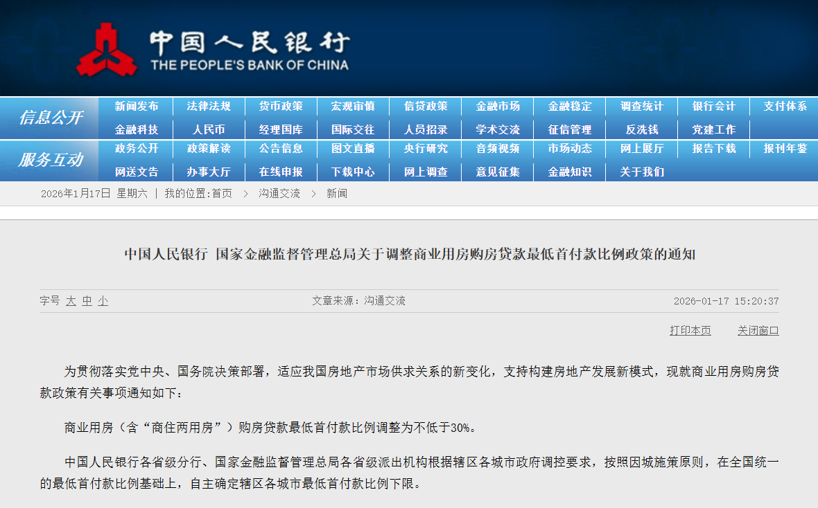 15:25【两部门:商业用房购房贷款最低首付款比例调整为不低于30%】中国人民银行、国家金融监督管理总局发布通知称,商业用房(含“商住两用房”)购房贷款最低首付款比例调整为不低于30%。中国人民银行各省级分行、国家金融监督管理总局各省级派出机构根据辖区各城市政府调控要求,按照因城施策原则,在全国统一的最低首付款比例基础上,自主确定辖区各城市最低首付款比例下限。