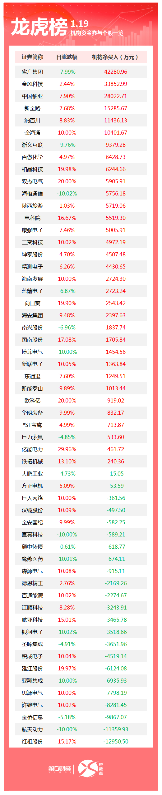 当天机构净买入前三的股票分别是省广集团、金风科技、中国铀业,净买入金额分别是4.23亿元、3.39亿元、2.8亿元。