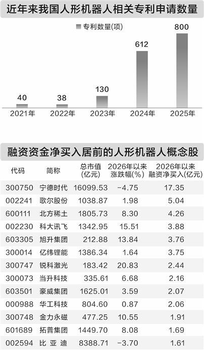 07:55【政策加码支持人形机器人发展 18股获融资资金净买入超亿元】据数据宝,1月21日,在国新办新闻发布会上,工信部副部长张云明表示,下一步将持续推动人形机器人技术创新和迭代升级,以人形机器人为小切口带动计算智能大产业发展。同时,工信部将加速“壮生态”,强化国家人工智能产业投资基金对人形机器人的支持力度,建设人形机器人开源社区,发布人形机器人与具身智能综合标准化体系建设指南,促进创新成果全球共享。在人形机器人领域,中国企业持续突破。在近期举办的2026年国际消费电子展(CES)上,中国人形机器人表现亮眼。据统计,2026年以来(截至1月20日),融资资金净买入额超1亿元的人形机器人概念股共计18只。宁德时代、歌尔股份、北方稀土、科大讯飞、旭升集团、亿纬锂能等净买入额均在3亿元以上。