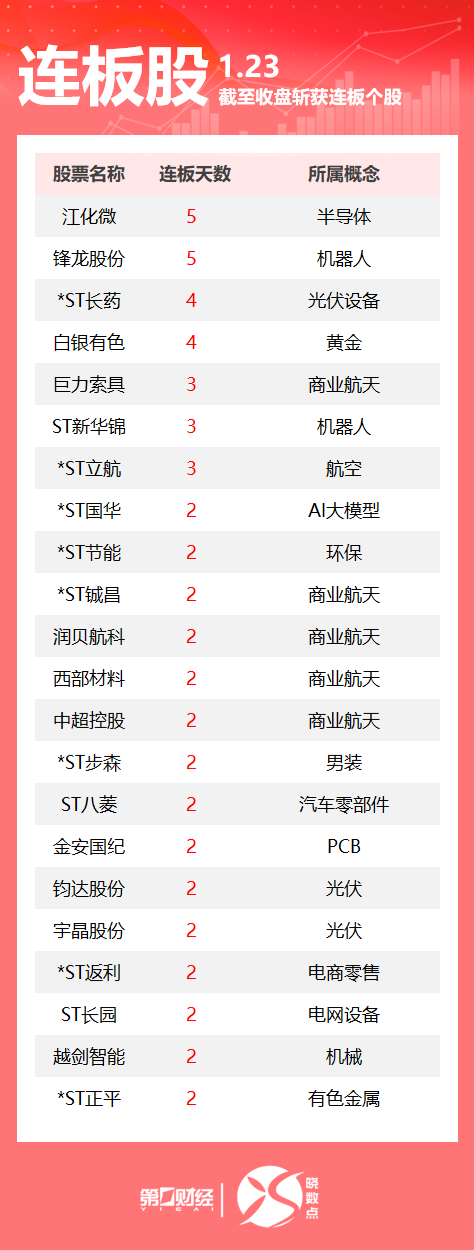 16:43【连板股追踪丨A股今日共122只个股涨停 这只商业航天股3连板】1月23日,Wind数据显示,A股市场共计122只个股涨停。其中商业航天板块多股连板,巨力索具3连板、润贝航科2连板;光伏板块钧达股份2连板。一图速览今日连板股>>