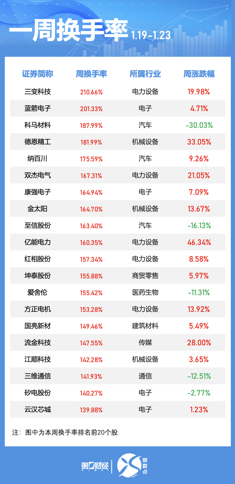 按照申万一级行业分类看,本周换手率100%以上的个股中,所属电力设备、电子等行业的个股居多。