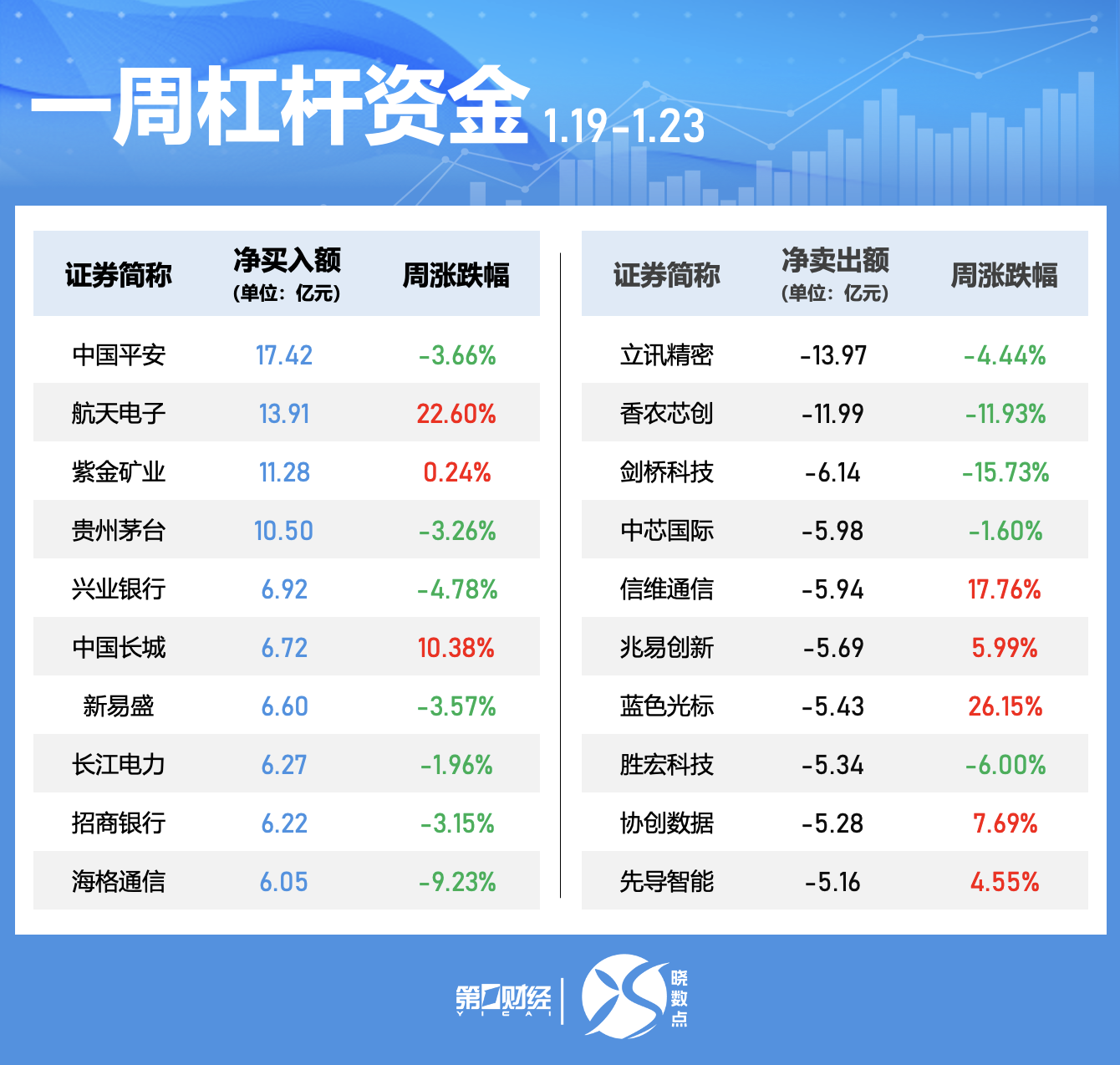中国平安本周获融资净买入居首,净买入额为17.42 亿元。航天电子、紫金矿业、贵州茅台净买入额居前,金额分别为13.91亿元、11.28亿元、10.5亿元;立讯精密、香农芯创、剑桥科技遭净卖出额居前,金额分别为13.97亿元、11.99亿元、6.14亿元。