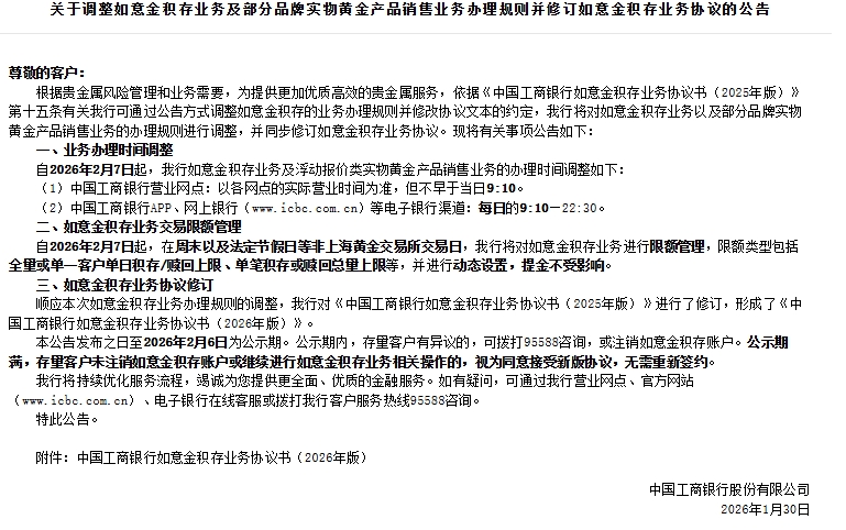 16:46【工行:自2月7日起,在周末以及法定节假日等非上海黄金交易所交易日,将对如意金积存业务进行限额管理】工商银行公告,自2026年2月7日起,在周末以及法定节假日等非上海黄金交易所交易日,将对如意金积存业务进行限额管理,限额类型包括全量或单一客户单日积存/赎回上限、单笔积存或赎回总量上限等,并进行动态设置,提金不受影响。