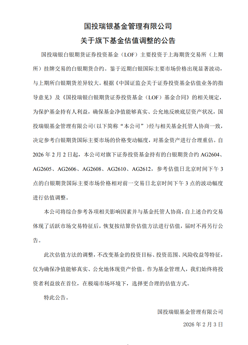 21:58【国投白银LOF:决定参考白银期货国际主要市场的价格变动幅度 对基金资产进行合理重估】国投白银LOF公告,鉴于近期白银国际主要市场价格出现显著波动,与上期所白银期货差异较大,公司决定参考白银期货国际主要市场的价格变动幅度,对基金资产进行合理重估。自2026年2月2日起,本公司对旗下证券投资基金持有的白银期货合约AG2604、AG2605、AG2606、AG2608、AG2610、AG2612,参考估值日北京时间下午3点的白银期货国际主要市场价格相对前一交易日北京时间下午3点的波动幅度进行估值调整。