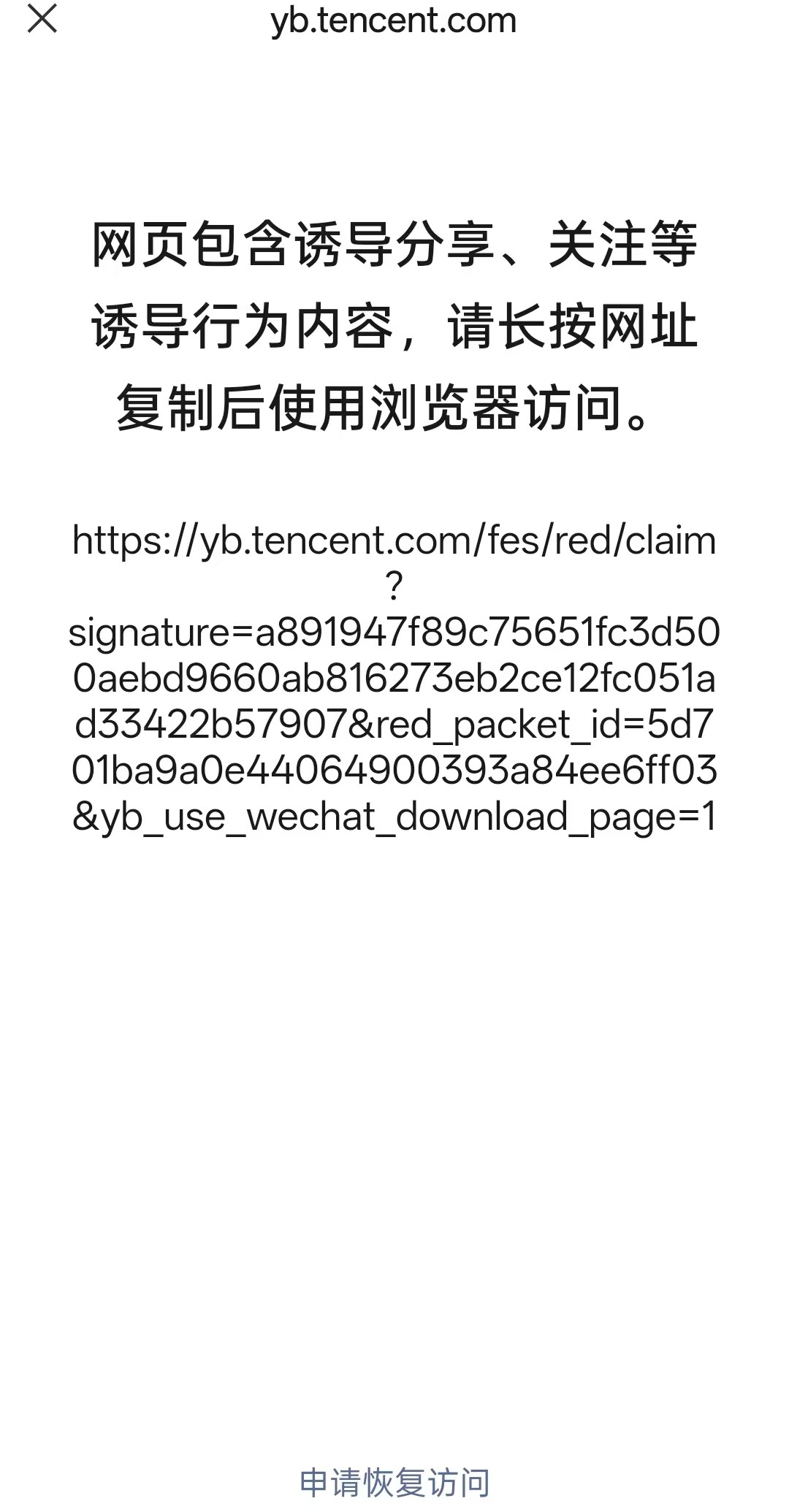 10:27【微信屏蔽元宝红包链接】2月4日,在分享元宝红包链接至微信时,页面提示“网页包含诱导分享、关注等诱导行为内容”。
