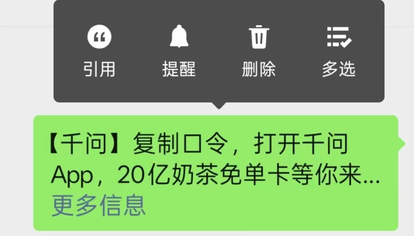 13:29【千问口令无法在微信复制分享】据一财记者实测,目前千问的春节活动口令无法在微信进行复制传播,选中千问的活动口令后,微信页面不显示复制键。