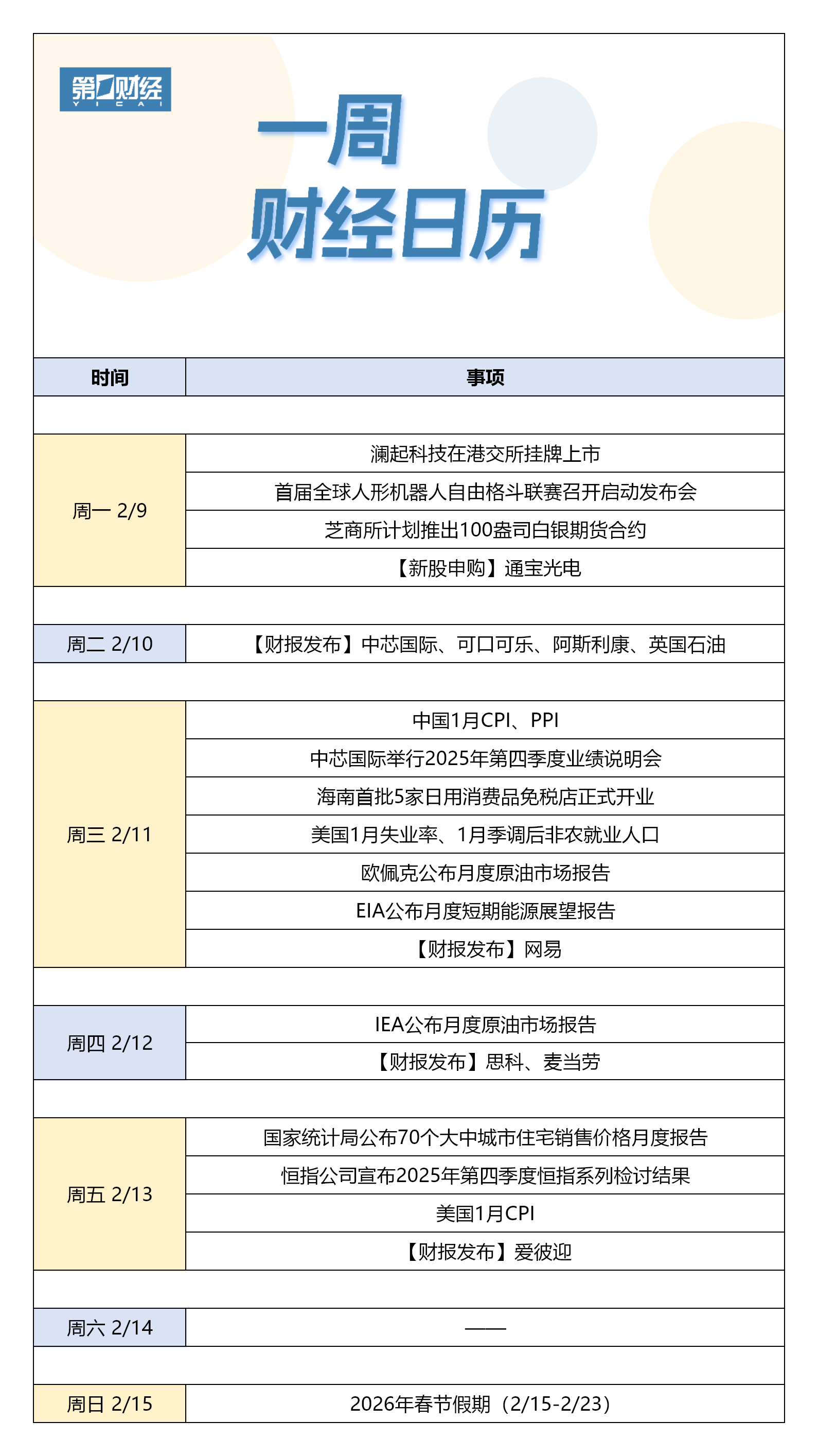 【下周财经日历】2月9日-2月15日