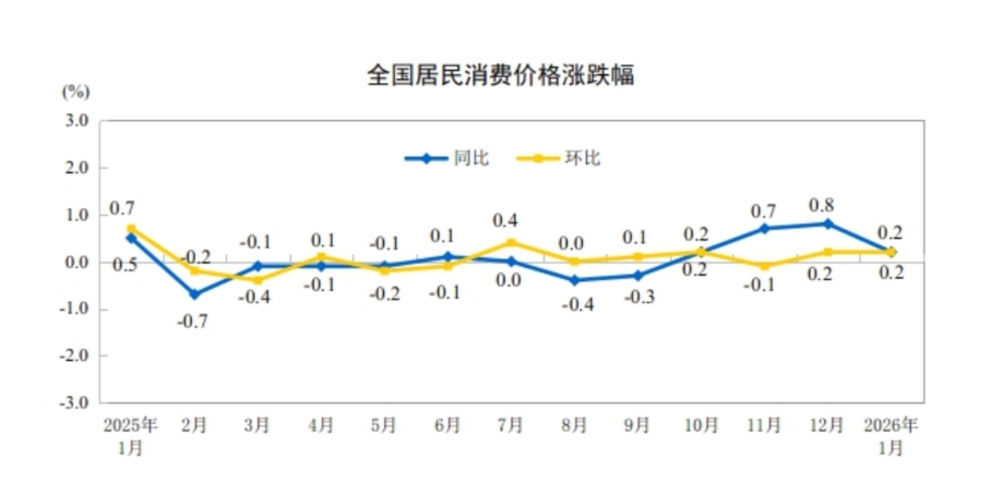 09:31【2026年1月份居民消费价格同比上涨0.2%】据国家统计局,2026年1月份,全国居民消费价格同比上涨0.2%。其中,城市上涨0.2%,农村上涨0.1%;食品价格下降0.7%,非食品价格上涨0.4%;消费品价格上涨0.3%,服务价格上涨0.1%。