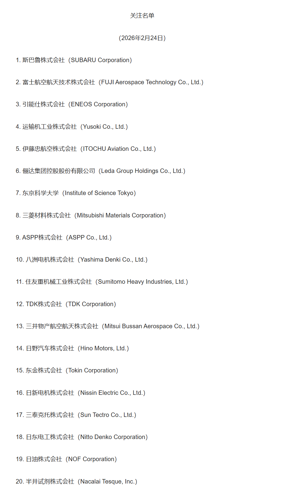 10:03【商务部:将20家日本实体列入关注名单】商务部公告,根据《中华人民共和国出口管制法》和《中华人民共和国两用物项出口管制条例》等法律法规有关规定,决定将斯巴鲁株式会社等无法核实两用物项最终用户、最终用途的20家日本实体列入关注名单。