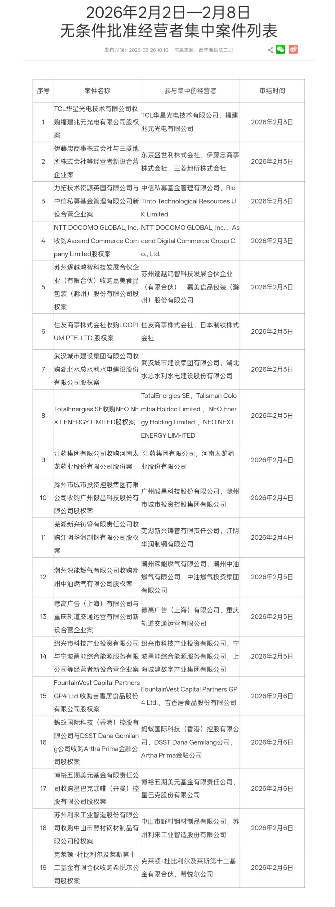 10:41【市场监管总局无条件批准TCL华星光电技术有限公司收购福建兆元光电有限公司股权案】市场监管总局公布2026年2月2日—2月8日无条件批准经营者集中案件列表,其中包括TCL华星光电技术有限公司收购福建兆元光电有限公司股权案。