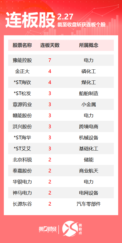15:27【连板股追踪丨A股今日共92只个股涨停 这只电力股7连板】2月27日,Wind数据显示,A股市场共计92只个股涨停。其中电力股豫能控股收获7连板,磷化工板块金正大4连板,小金属板块章源钨业3连板。一图速览今日连板股>>