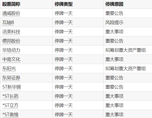 09:01【A股停牌提示:12股今日停牌】Wind数据显示,3月5日,通威股份、瓦轴B、洁美科技等12只个股停牌。
