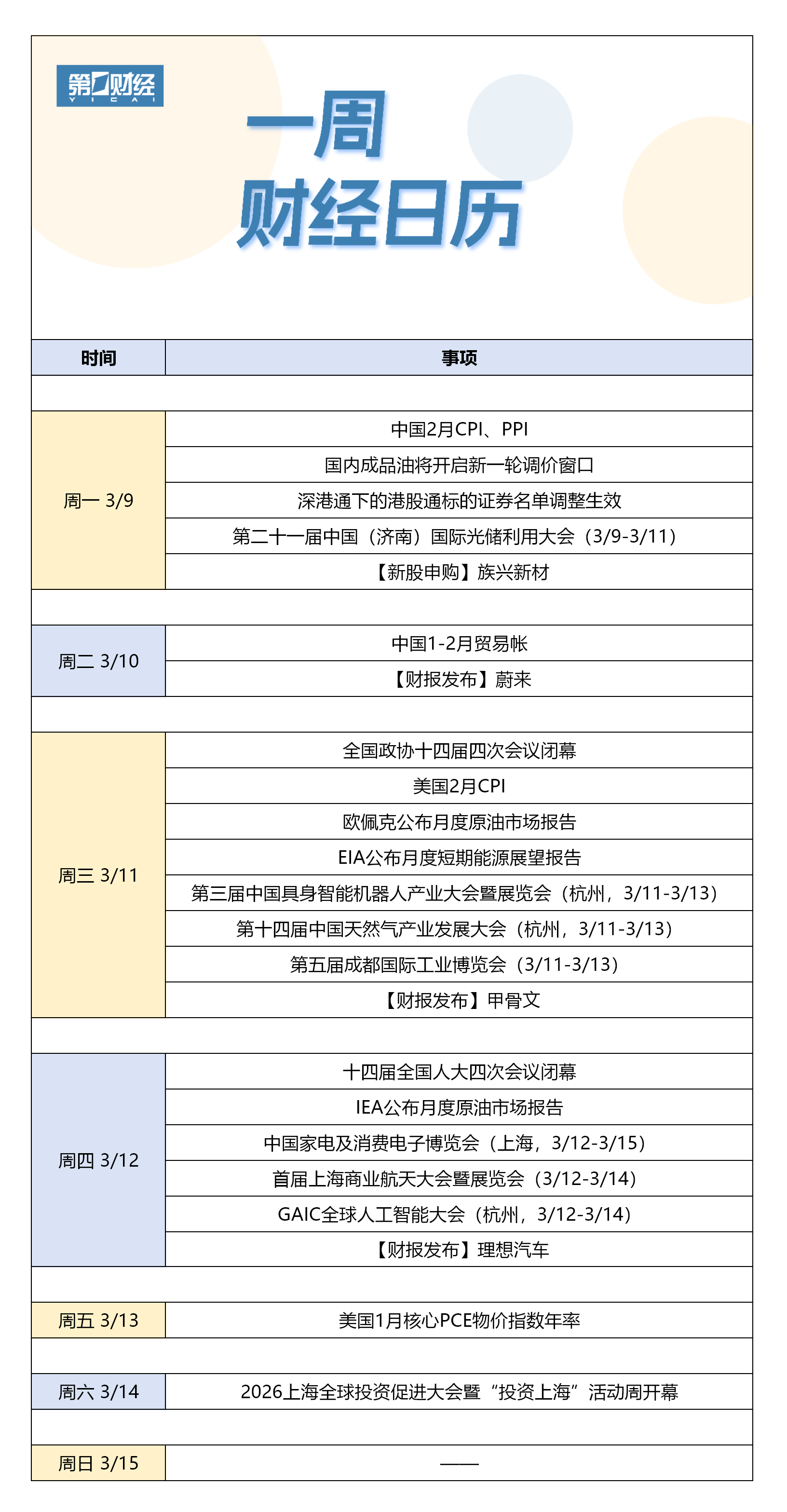 【下周财经日历】3月9日-3月15日