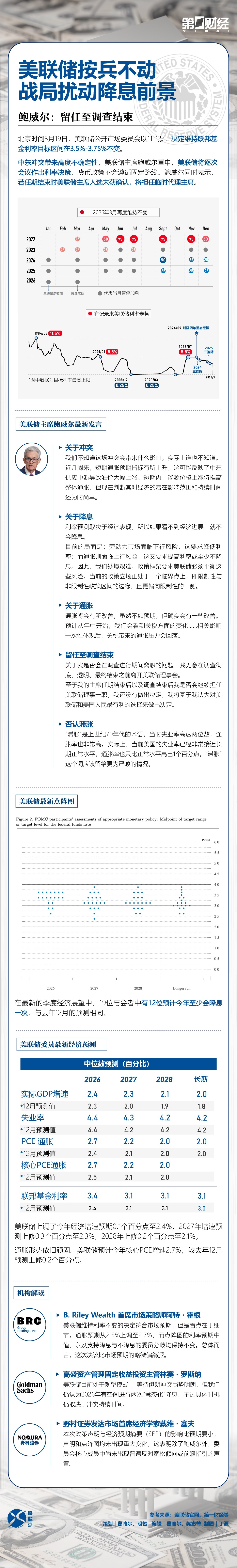 07:59【晓数点|美联储按兵不动,战局扰动降息前景】北京时间3月19日,美联储公开市场委员会以11-1票,决定维持联邦基金利率目标区间在3.5%-3.75%不变。中东冲突带来高度不确定性,美联储主席鲍威尔重申,美联储将逐次会议作出利率决策,货币政策不会遵循固定路线。鲍威尔同时表示,若任期结束时美联储主席人选未获确认,将担任临时代理主席。