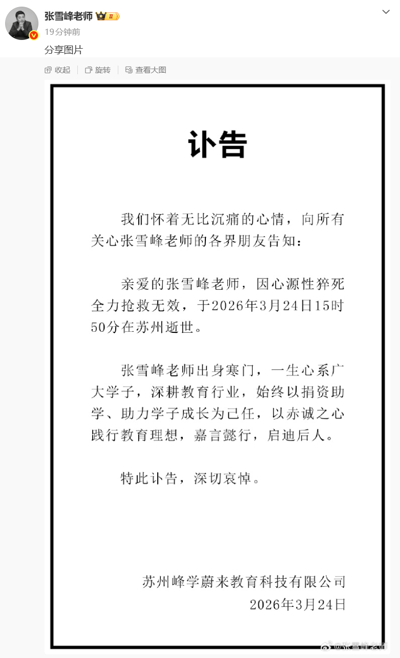 21:57【张雪峰因心源性猝死抢救无效去世】3月24日晚,苏州峰学蔚来教育科技有限公司发布讣告:张雪峰因心源性猝死全力抢救无效,于2026年3月24日15时50分在苏州逝世。