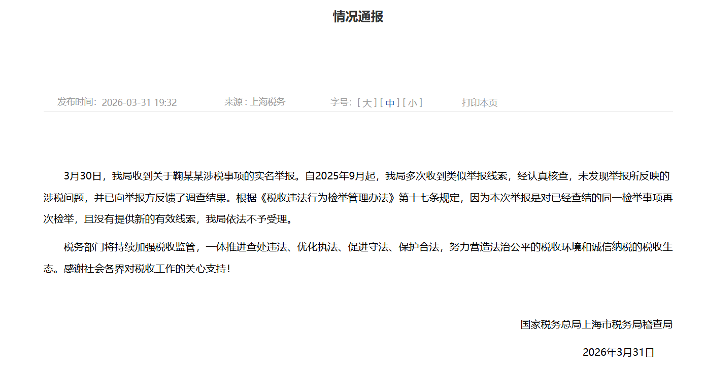 19:36【税务部门回应鞠婧祎涉税事项】据国家税务总局上海市税务局消息,3月30日,我局收到关于鞠某某涉税事项的实名举报。自2025年9月起,我局多次收到类似举报线索,经认真核查,未发现举报所反映的涉税问题,并已向举报方反馈了调查结果。根据《税收违法行为检举管理办法》第十七条规定,因为本次举报是对已经查结的同一检举事项再次检举,且没有提供新的有效线索,我局依法不予受理。税务部门将持续加强税收监管,一体推进查处违法、优化执法、促进守法、保护合法,努力营造法治公平的税收环境和诚信纳税的税收生态。感谢社会各界对税收工作的关心支持!