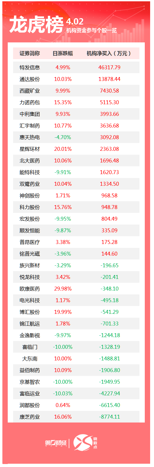 当天机构净买入前三的股票分别是特发信息、通达股份、西藏矿业,净买入金额分别是4.63亿元、1.39亿元、7431万元。