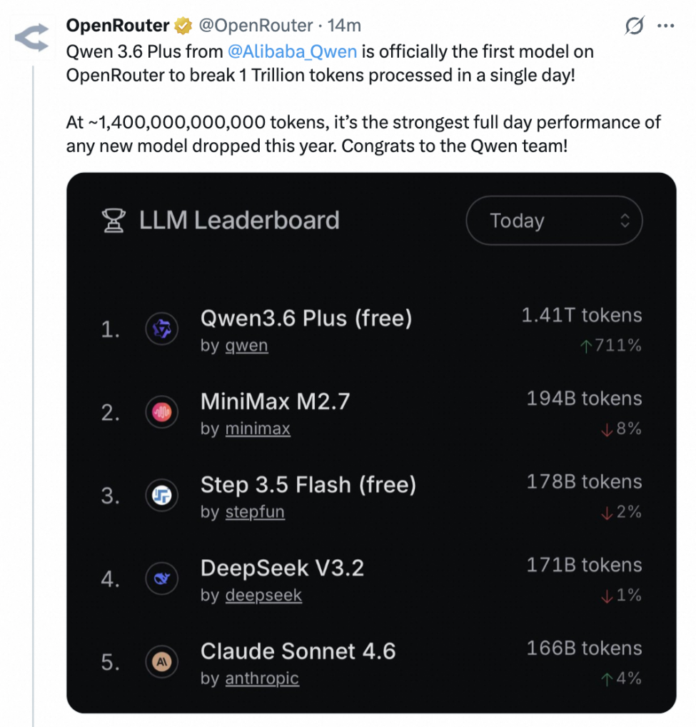 13:25【阿里千问3.6Plus大模型登顶全球模型调用排行榜首】4月4日消息,发布仅1天的阿里千问新模型Qwen3.6-Plus,冲上全球知名大模型API调用平台OpenRouter的日榜榜首,成为当下最受企业和开发者热捧的大模型。OpenRouter官方数据显示,Qwen3.6-Plus的日调用量突破1.4万亿Token,打破了该平台的单日单模型调用量的全球纪录。