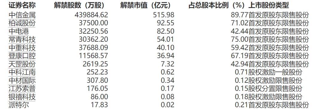 从解禁市值来看,7家公司解禁市值超亿元。中信金属、柏诚股份、中电港解禁市值居前,解禁市值分别为515.98亿元、92.55亿元、82.5亿元。