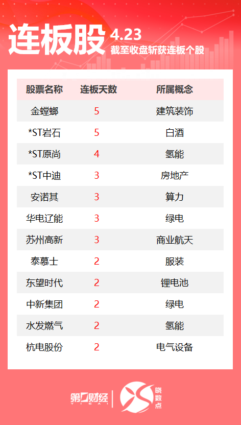 15:21【连板股追踪丨A股今日共59只个股涨停 金螳螂收获5连板】4月23日,Wind数据显示,A股市场共计59只个股涨停。其中,建筑装饰板块金螳螂收获5连板,商业航天板块苏州高新3连板。一图速览今日连板股>>