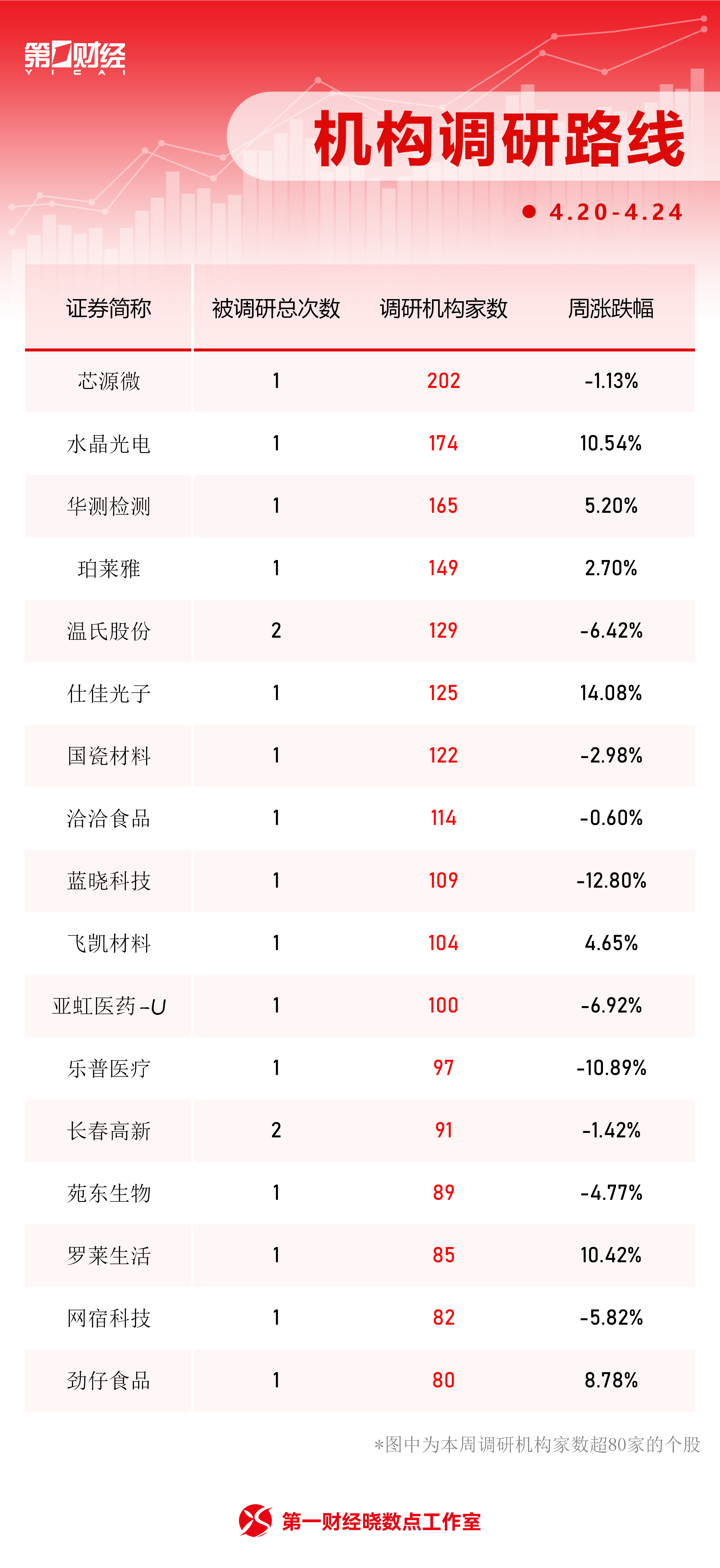 00:18【机构最新调研路线图出炉 芯源微最受关注】Wind数据显示,机构本周(4月20日至4月24日)共调研了385家上市公司,其中芯源微最获关注,参与调研的机构为202家。水晶光电、华测检测、珀莱雅分别获174家、165家、149家机构调研。