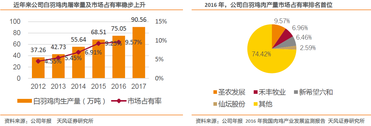 天风证券指出,自繁自养的全产业链经营,是公司产品品质的根本保障,也为公司带来了客户优势,并使得公司在鸡肉这一同质化产品中实现了品牌溢价。公司通过优化内部管理,推动生产成本大幅下降。国内分散的产业结构以及国外巨头JBS全球35亿羽屠宰规模以及巴西市场35%的市占率都表明,公司还有广阔的成长空间。