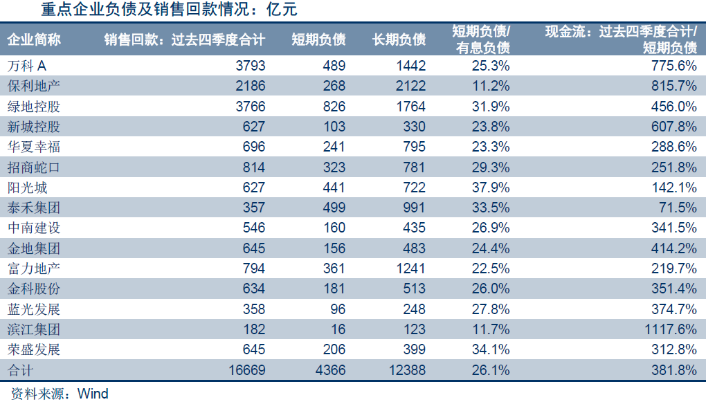 中信证券认为,大中型公司债务期限结构合理,短期偿付压力不大。统计显示,15家A股上市地产大中型企业有息负债情况,一年内到期短期负债占有息负债26.1%。过去四个季度,这些公司销售回款相当于未来一年需要偿还借款的3.8倍——这也说明即使销售出现下滑,大中型企业债务偿还压力也不大。企业抵御风险的根本并不在静态货币资金,而在于动态经营活动的回款。预计2018年下半年销售回款仍旧是比较顺利的。