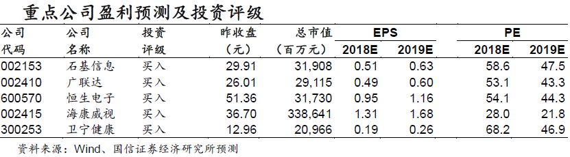 国信证券还指出,经济去杠杆会影响政府的一些高资本项目IT支出,政府的IT支出将更加理性。安防行业仍然是高景气行业,龙头公司优势显著,智能化时代有希望再次引领全球的产品方向。自主可控关注核心领域,尤其是核心芯片。信息安全的市场集中趋势让行业竞争格局改善,龙头公司优势越发明显。而传统的系统集成公司在云时代率先转型的将有更好的发展。