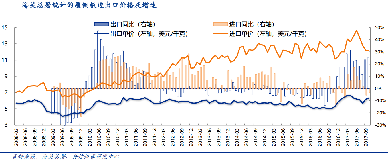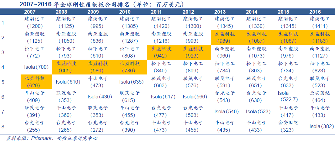 一般各家覆铜板对特定客户的销售价格并不公开,安信证券引用国内PCB龙头深南电路招股说明书中的采购数据,发现成熟产品FR-4采购价格最低,每平方米价格不足百元,但经过聚苯醚树脂改性的FR-4价格高了一倍,高端材料由于附加值高得多,原材料成本在收入中占比很小,受原材料价格周期性的影响可以忽略,因此弹性也最大。