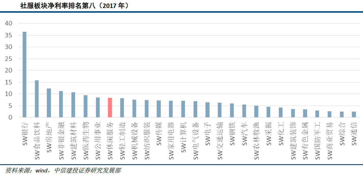 经营方面,中信建投认为消费行业的盈利能力较为稳健,在目前的排名中靠前,社服行业公司经营具备消费行业经营稳健特点,尽管少有在短期爆发式增长,但具备穿越长期周期的成长趋势:①净利率达到8.33%,在申万一级行业中排名第8位;②社服行业三年的归母净利润增速分别为78%、19%、35%。