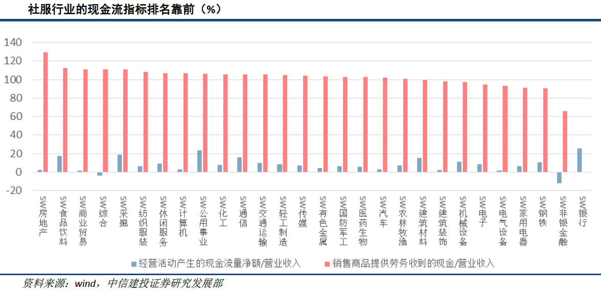 在防风险方面,由于现金流健康(社服行业销售商品提供劳务收到的现金/营业收入达107%,排名第7位),社服行业具备较高的防风险能力,其速动比率和流动比率分别达到1.25、1.65,排名均在第5位;股票质押比例约33.2%,处在中偏低的位置,风险相对较小。