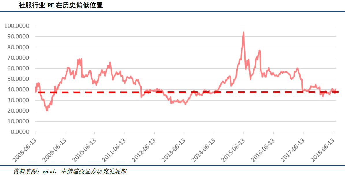 中信建投认为国企改革步步推进,利好龙头企业。社会服务板块中,56%的上市公司都是国有控股,国企改革政策对其影响较大。从旅游资源的掌握上,国企具备先天发展条件,并已经在免税、景点、旅行社、酒店等重点旅游产业上形成巨大的优势。国企改革不仅有混合所有制的探索落地,还有业内企业的“强强联合”,在政策导向下,社会服务板块的龙头企业具有较大政策红利预期。