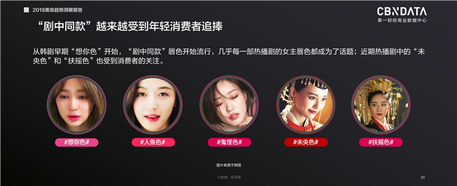 年轻人除了容易受KOL影响,热门剧集中的“同款色”亦是他们种草的渠道。从前几年随着韩剧热播逐渐流行出来的想你色、星你色、人鱼色、鬼怪色到国产剧中的未央色和扶摇色,剧中女主的同款色号受到了消费者的热捧。