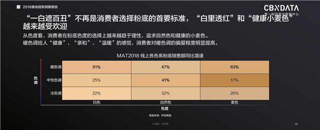 日渐成熟的线上美妆消费者,不仅在购买品类上寻求拓展,在购买偏好上也日渐多样化,“一白遮百丑”的粉底液首要选购标准正被打散。根据CBNData《报告》显示,给人“健康”“亲和”“温暖”感觉的暖色调粉底液日益受到消费者的偏爱,其中自然色和小麦色粉底液销售额增速显著,可见消费者在粉底色度的选择上日趋理性,自我认知不断提升。