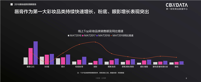 在如今高速增长的线上彩妆市场中,越来越多的消费者正在购买的是什么品类呢?消费者选择在线上购买美妆的第一选择又会是什么?答案都是“口红”。CBNData《报告》显示,口红不仅是2018年线上彩妆的第一大品类,更是消费者线上购买彩妆的第一选择,且呈现着越买越多的趋势。